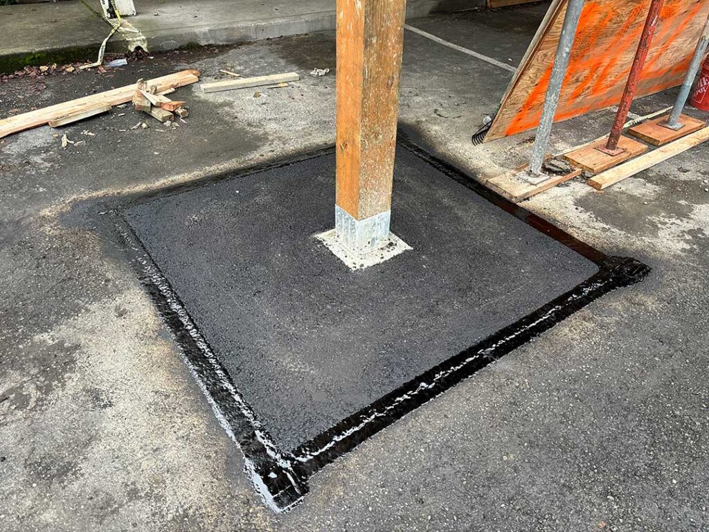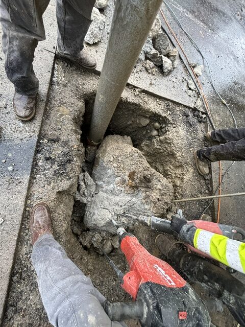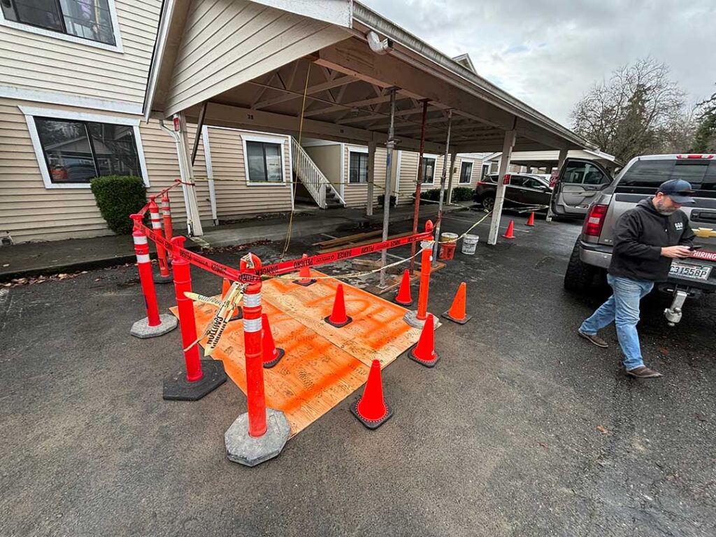 Footing removal and replacement of asphalt patch due to damage caused by thieves crashing into a carport pillar with a stolen vehicle. Doing our part to restore parking access for tenants.